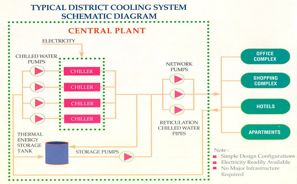 District Cooling System (DCS) is an outsourced solution that provides cooling energy to built environments that are strategically located within the region of a centralised cooling plant. The centralised cooling production distributes cooling energy in the form of chilled water through underground insulated pipeline to buildings within a district, operating 24 hours a day every day. Advantageously replacing conventional installation of individual chillers in each building, the district cooling can help building owners improve space utilisation and reduce electricity consumption through sharing of a centralised DCS.
