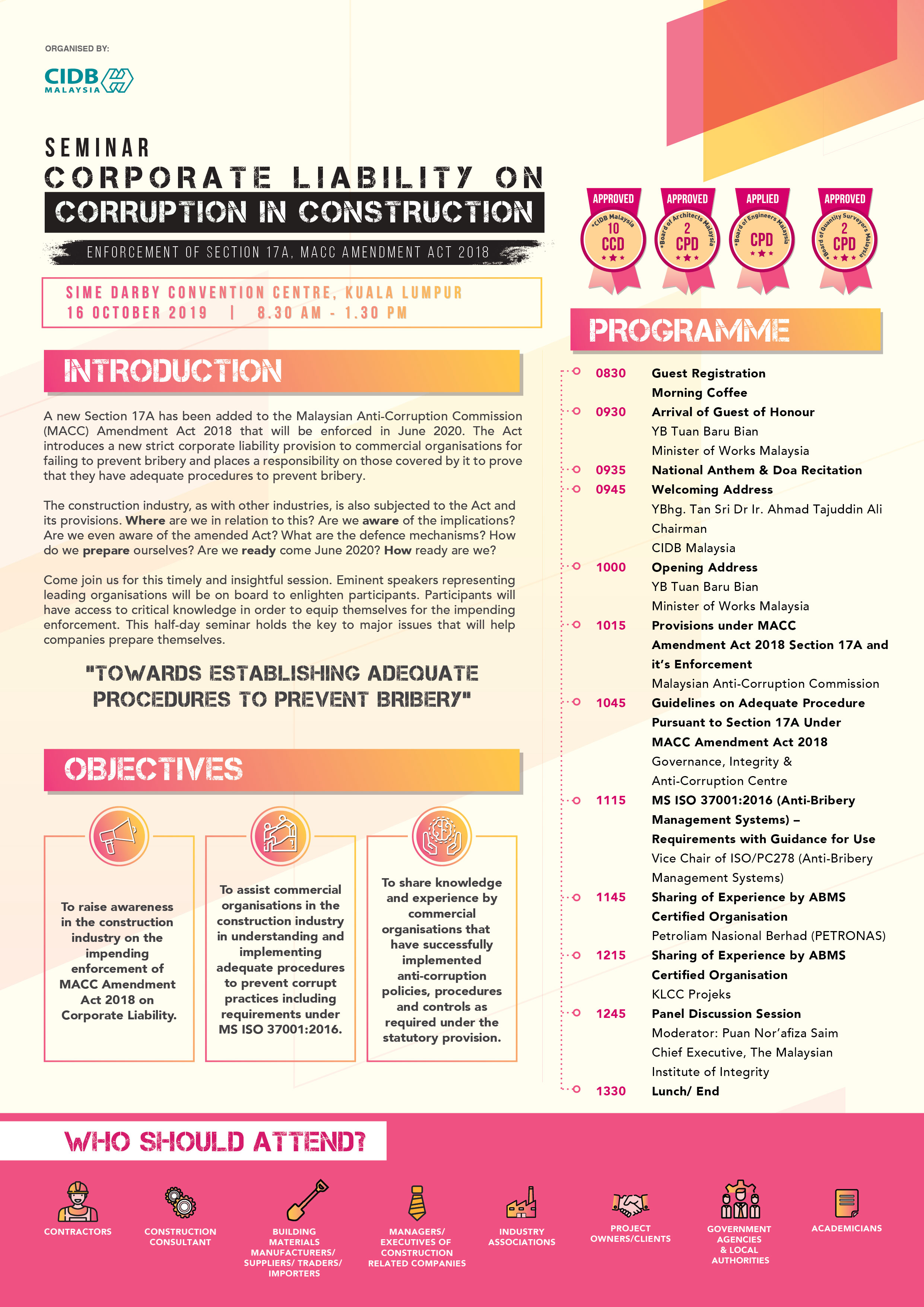SEMINAR CORPORATE LIABILITY ON CORRUPTION IN CONSTRUCTION ENFORCEMENT OF SECTION 17A, MACC AMENDMENT ACT 2018